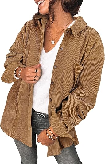 Womens Corduroy Shirt Long Sleeve Oversized Button Up V Neck Blouses Tops Loose Shacket Jacket