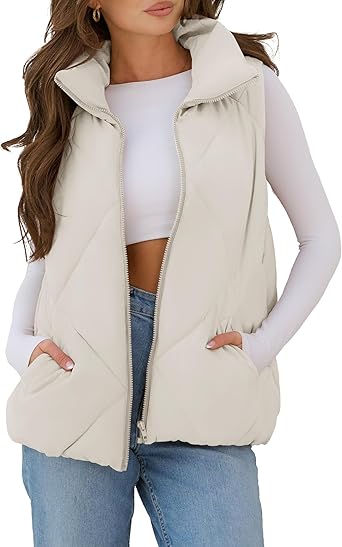 Womens 2024 Puffer Vest Sleeveless Zip Up Quilted Coat Stand Collar Gilet Jacket With Pockets