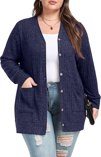 Plus Size Sweater for Women Long Sleeve Buttons Down Cardigans Casual Jacket Coat with Pockets