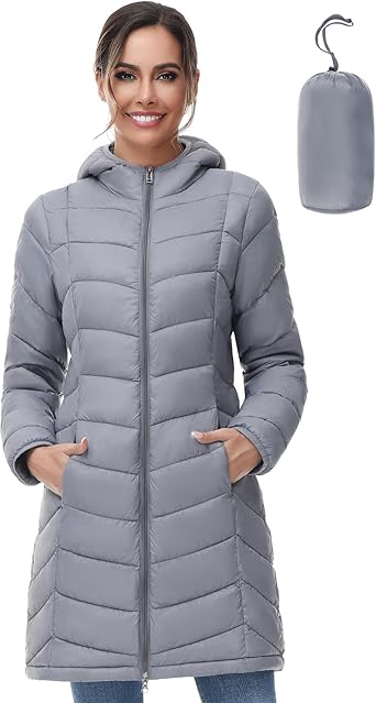 Women Lightweight Down Puffer Coat, Women Hooded Mid-Length Packable Winter Jacket with 2 Packing Bag