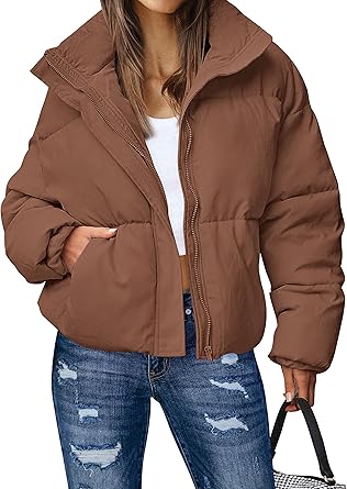 Women's Winter Long Sleeve Zip Puffer Jacket Stand Collar Baggy Short Down Coats with Pockets