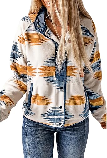 Womens Fleece Jacket Western Aztec Print Long Sleeve Snap Button Down Shacket Jackets with Pockets